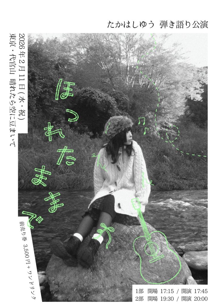 ”たかはしゆう 弾き語り公演「ほつれたままで」”と題し、来年2/11(水・祝)に代官山・晴れたら空に豆まいてにて開催いたします。
